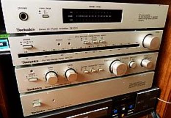 Rare ensemble hifi Technics taille midi de grande qualité. Haute technologie audiophile, connectiques Cinch dorées, tableaux d'information gravés sur le capot supérieur (courbes de réponse pour tuner, ampli, pré, schéma technique pour l'alim), pattes avant dépliables