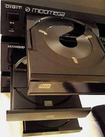 Platines lectrices voire enregistreuses de disques audionumériques compacts, empilées tiroirs ouverts, de haut en bas : MICROMEGA Digit [avec bloc optique Philips], KENWOOD, LUXMAN [vendues]