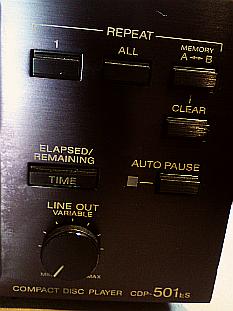 Détail d'une platine CD série ES, LA platine laser Vintage SONY CDP-501 ES, jadis dipSONYble céans, que le Client est venue chercher sur place avec une SONY CDP-790 & sa télécommande pour la route (et pour sa femme)) – ladite télécommande pilote d'ailleurs les 2 lecteurs laser, pratique, mais pas l'épouse